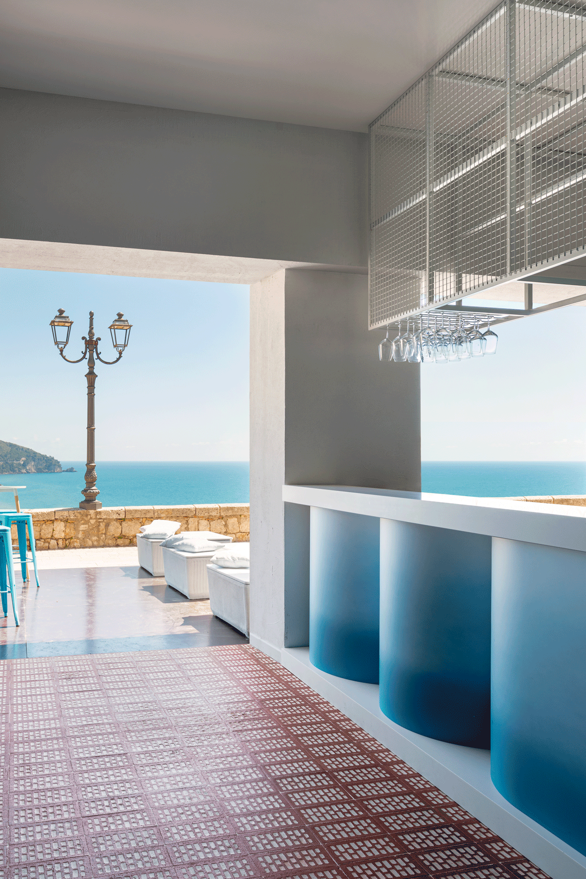 The choice of colors (white, blue, and brown), textures, and the sinuous design of the furnishings tell the story of Gae Avitabile's decision to reproduce the maritime and architectural landscape of the city of Sperlonga inside the bar. This intention is made even more evident by forgoing existing fixtures, creating an internal environment in constant and mutual communication with the surrounding nature and all the sounds that inhabit it. The materials chosen, such as the classic perforated terracotta bricks filled with white lime and subsequently resin-coated, convey a sense of craftsmanship and lend the bar an air of sophistication.